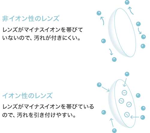 ネオサイト14はマイナスイオンを帯びていない非イオン性の素材を使用しているので、タンパク質などの汚れがつきにくいレンズです。