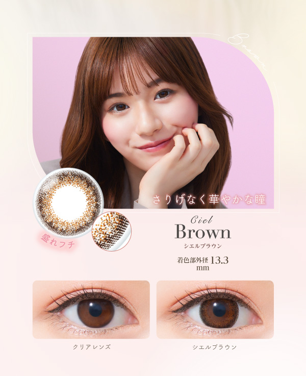 ネオサイトワンデー シエルUVで人気のブラウン&グリーンをラインナップ。サークルでもなくカラコンでもない、3トーンのナチュラルカラー。ぱっちり感もありつつ、瞳に馴染むほどよい華やかさが女性らしさを引き立てます。快適に過ごせるように、つけごこちにもこだわったレンズデザイン(レンズ直径14.2mm)&着色部外径は自然に大きく見えて、デイリーに使いやすい13.3mm。