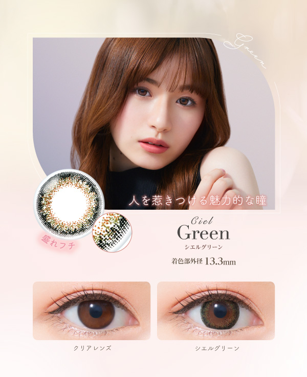瞳の色に落ち着いたグリーンとオレンジが重なって、人を惹きつける魅力的な目元へ。もともと持つあなたの瞳のキレイな色を、より一層引き立てます。