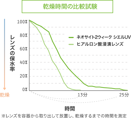 レンズの保水率から、乾燥するまでの時間を調べました。ネオサイト2ウィーク シエルUVはヒアルロン酸浸漬レンズの約2倍の保水力があります。
