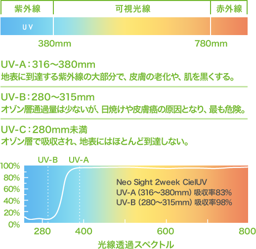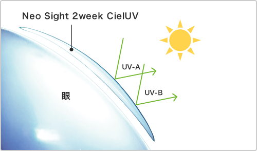 ネオサイト2ウィーク シエルUVは、UV-A(皮膚を老化させたり、肌を黒くする紫外線)を83%カット、UV-B(最も危険で日焼けや皮膚癌の原因となる紫外線)を98%カット。