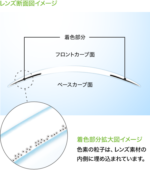 カラーレンズは瞳に負担がかかりそう、なんて思われがちですが、ネオサイトワンデー リングはレンズ素材で着色部分を包み込んだ、Wrap-In構造。色素がまぶたや角膜などに直接触れないので、安心してお使いいただけます。