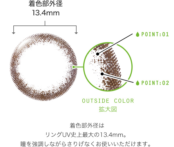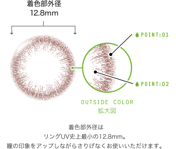 カラーレンズは瞳に負担がかかりそう、なんて思われがちですが、ネオサイトワンデー リングUVはレンズ素材で着色部分を包み込んだWrap-In構造。安心してお使いいただけます。