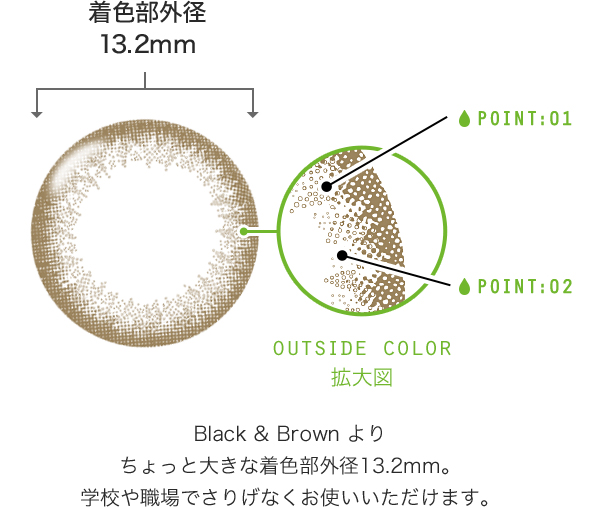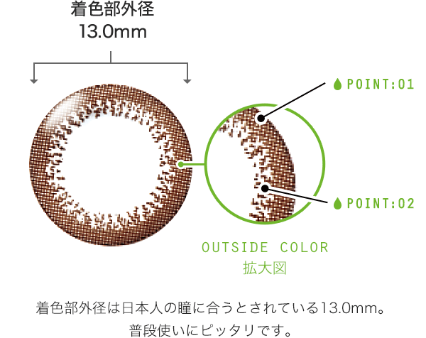 黒い瞳の方にはほんのりやさしいブラウンをプラスし、茶色い瞳の方にはより自然に瞳をちょっと大きくみせます。流行に左右されない洗練されたナチュラルデザイン。