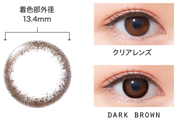 元の瞳のフチをひと回り大きくしたようなデザインで、どんなテイストにも合うアッシュ系のダークブラウンです。コーディネートやメイクに迷った朝も、ダークブラウンがあれば安心です。