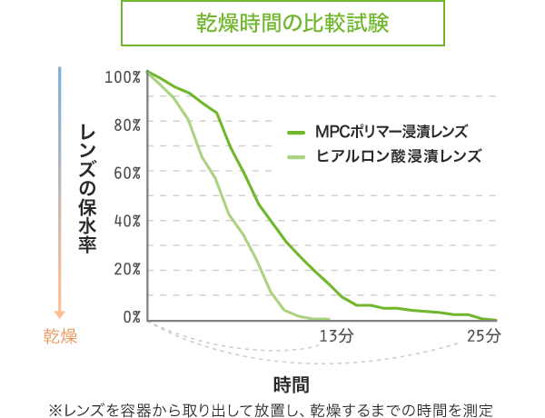 レンズの保水率から、乾燥するまでの時間を調べました。ネオサイトワンデー リングUVはヒアルロン酸浸漬レンズの約2倍の保水力があります。