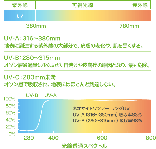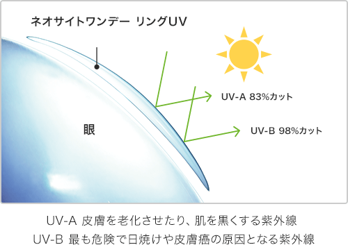 ネオサイトワンデー リングUVは、UV-A(皮膚を老化させたり、肌を黒くする紫外線)を83%カット、UV-B(最も危険で日焼けや皮膚癌の原因となる紫外線)を98%カット。