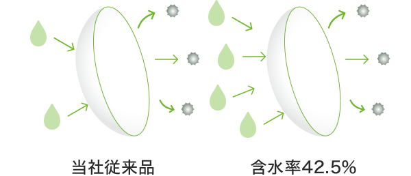 装用感と乾燥感のバランスを考え、水分を適度に多く含む素材(含水率42.5%)を新たに採用。乾燥しにくさはキープしつつ、よりなめらかなつけ心地に。さらに、タンパク質などの汚れがつきにくい非イオン性の素材を使用しているので、朝から晩まで快適なつけ心地が続きます。 ※装用感には個人差があります。